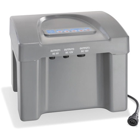- Ausgang 3: 18 VDC, max. 2 A (36 W), Timerbetrieb wählbar (Pumpe läuft in jeder Stunde für ca. 10 Min.)