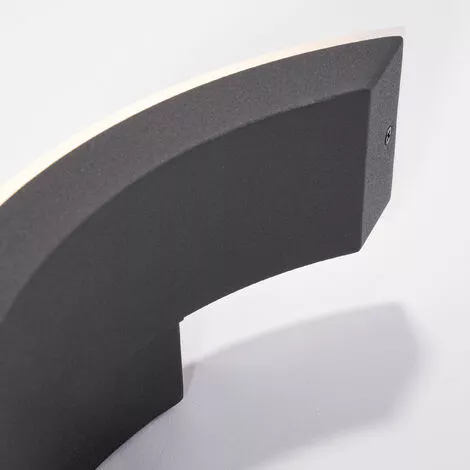 In der LED-Außenwandleuchte SwingLine vereinen sich modernes Design mit durchdachter energiesparender Technik. Dafür reduziert die Leuchte ihre Formen auf einen konvex geschwungenen Halbkreis aus anthrazitfarbenem Aluminium, der an einer trapezförmigen Wandhalterung angebracht ist. An der Unterseite dieses Halbkreises befindet sich die Leuchtfläche mit 96 LEDs, die von einer mattierten Kunststoffscheibe bedeckt werden. Die geschwungene Form der Leuchtfläche und die Anordnung der LEDs sorgen dafür, dass das warmweiße Licht ohne Lichtverluste nach unten geleitet wird, die Mattierung der Scheibe verteilt das Licht gleichmäßig und ohne Blendeffekte.