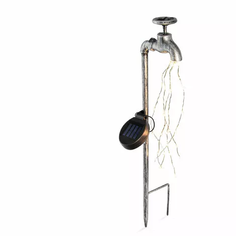 Ganz schlicht und doch so bezaubernd ist diese Solardekoleuchte in Form eines Gartenwasserhahnes: An einem Stahlrohr im Vintage-Style ist ein antik anmutender Wasserhahn angebracht, aus dem fünf LED-Lichterfäden wie ein Wasserstrahl nach unten fließen und ihr warmweißes Licht über den Boden träufeln.