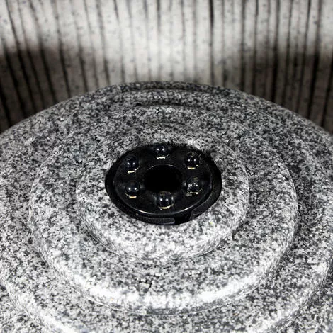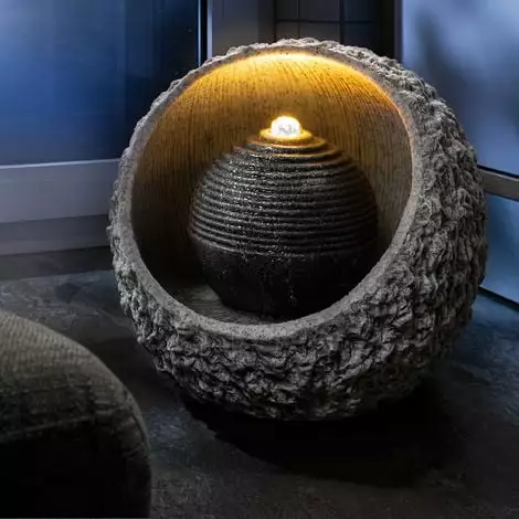 Der Polyresin-Zimmerbrunnen RockStone mit LED Beleuchtung ist ein moderner runder Zimmerbrunnen, der Ihrem Zuhause ein elegantes Ambiente verleiht. Das Wasser quillt oben aus der von LED beleuchteten Öffnung des Quellsteins und rinnt über diesen in die äußere Schale, die gleichzeitig wie eine sichere Höhle für den Quellstein bildet. Der Zimmerbrunnen besteht aus Polyresin, einem modernen Hightech-Kunststein. Damit wirkt der Brunnen zwar wie ein steinerner Brunnen und sieht diesem auch täuschend ähnlich, ist jedoch viel leichter und vor allem viel stabiler als schwerer Stein.