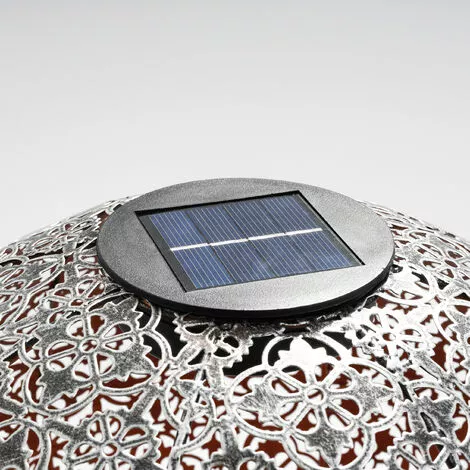 Die Solarkugel Basima ist der strahlende Mittelpunkt eines bezaubernden Farb- und Schattenspiels, das uns an die Märchen aus 1001 Nacht denken lässt: Das hochwertige Stahlblech, aus dem die große Kugel gefertigt ist, wird von einem filigranen Muster aus symmetrischen Blütenformen durchbrochen, durch das sich das bernsteinfarbene Licht der LED als Muster über den Boden ergießt. Die warm-orangene Farbgebung wird noch durch einen sanften Terrakotta-Ton verstärkt, mit dem die Innenseite der Solarkugel versehen ist.