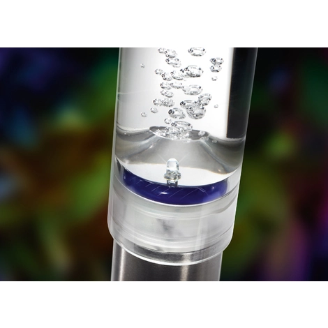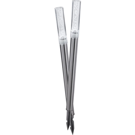 Der bezaubernde Effekt der »Twin« Solarleuchten beruht auf den zahllosen Luftbläschen, die inmitten ihrer glattpolierten Kunststoffköpfe emporzusteigen scheinen. Tatsächlich verharren sie an Ort und Stelle, um das von unten eingestrahlte Licht zu streuen.